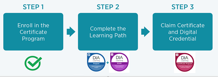 Participants will earn digital credentials as they continue along the Learning Path, which is composed of 6 modules and a comprehensive certificate exam, ultimately culminating in the granting of the DIA Patient Engagement Certificate represented by the digital credential. Enrollment in the Patient Engagement Certificate Program is free. Participants pay registration fees for the online courses and the comprehensive exam to complete the program. CE credit is available to participants upon completion of each module in the certificate program, at no additional cost. See individual module overview for specific CE information. Enroll in the Certificate Program today and begin tracking your progress towards completion and earning your digital credentials!